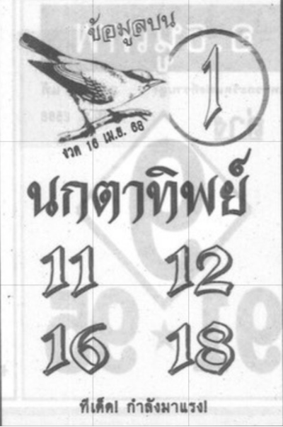 แนวทางหวยนกตาทิพย์งวดนี้ คัดสรรเลขเด็ดนกตาทิพย์ หวยดังมาแรง วิเคราะห์หวยซองนกตาทิพย์ เข้าเกือบทุกงวด ติดตามหวยซองเด็ดๆ หวยนกตาทิพย์งวดนี้ ให้คนรักเลขเด็ด ได้เลือกพิจารณาสลากกินแบ่งรัฐบาล กันก่อนใคร